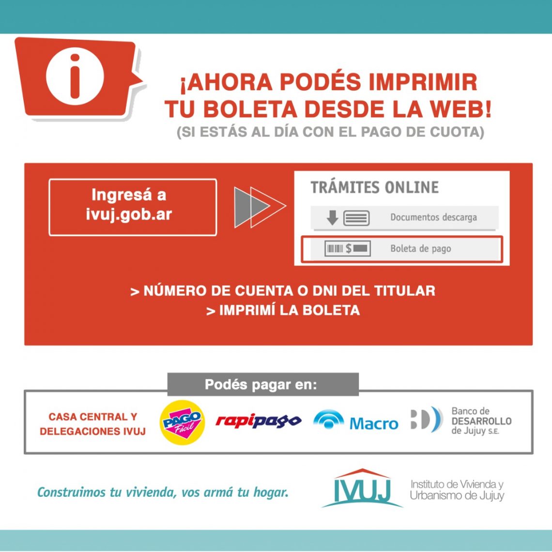 Para imprimir la boleta se debe ingresar a ivuj.gob.ar buscar trámites on line y “Boleta de Pago”; cargar número de cuenta y/o DNI del titular; e imprimir la boleta, para efectuar el pago en las siguientes cajas: Rapipago, Pago Fácil, Banco Macro, Banco de Desarrollo de Jujuy, Casa Central y Delegaciones IVUJ (sólo por turno gestionado por whatsapp) y Transferencia Bancaria.