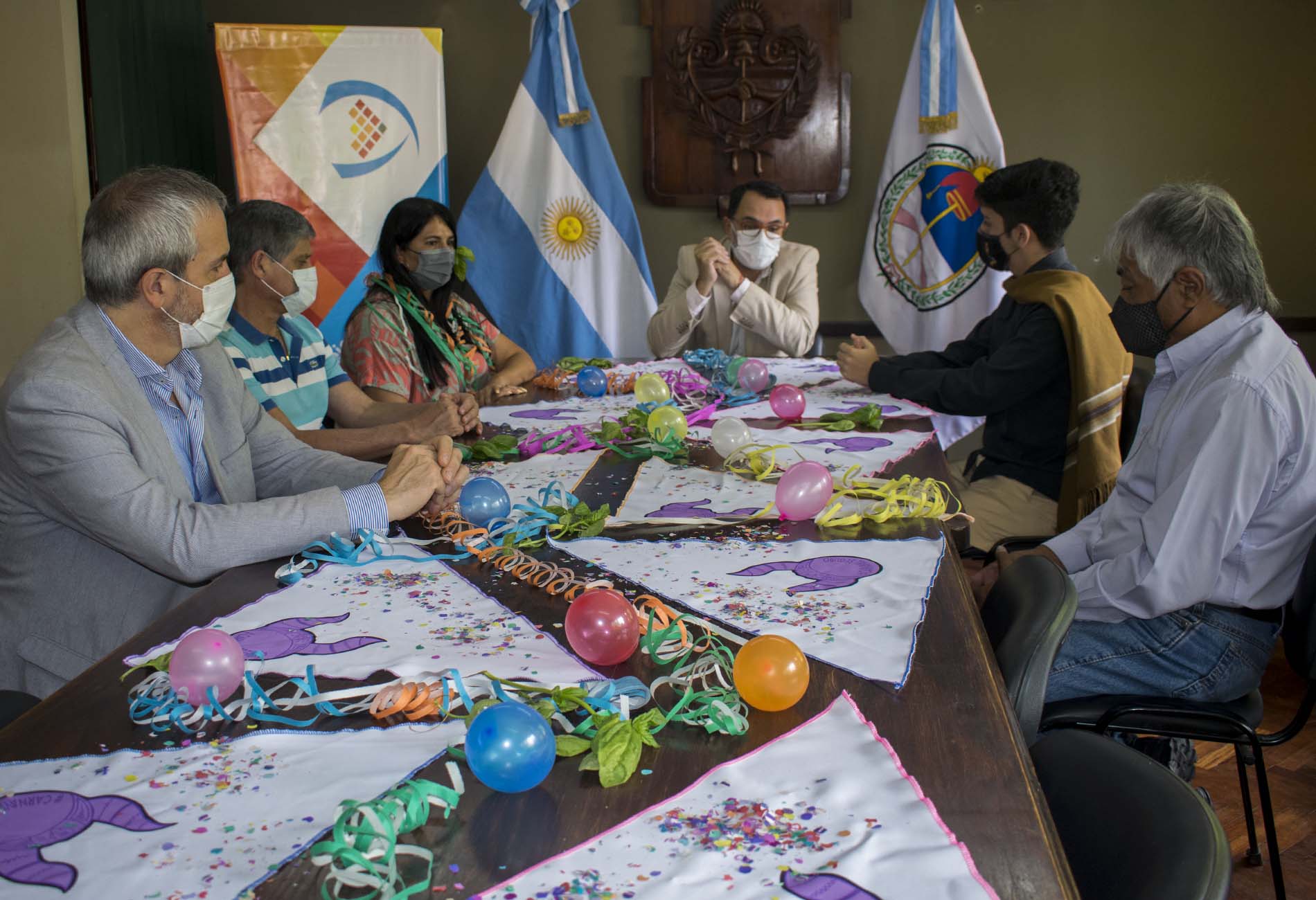 El presidente del organismo parlamentario, Lisandro Aguiar y los concejales Patricia Moya, Mario Lobo, Roberto Brizuela y José Rodríguez Bárcena, al finalizar el encuentro hicieron entrega de pañuelos con el logo identificatorio del Carnaval Seguro, para que sigan repartiendo en comercios o espacios que se quieran sumarse a la iniciativa.