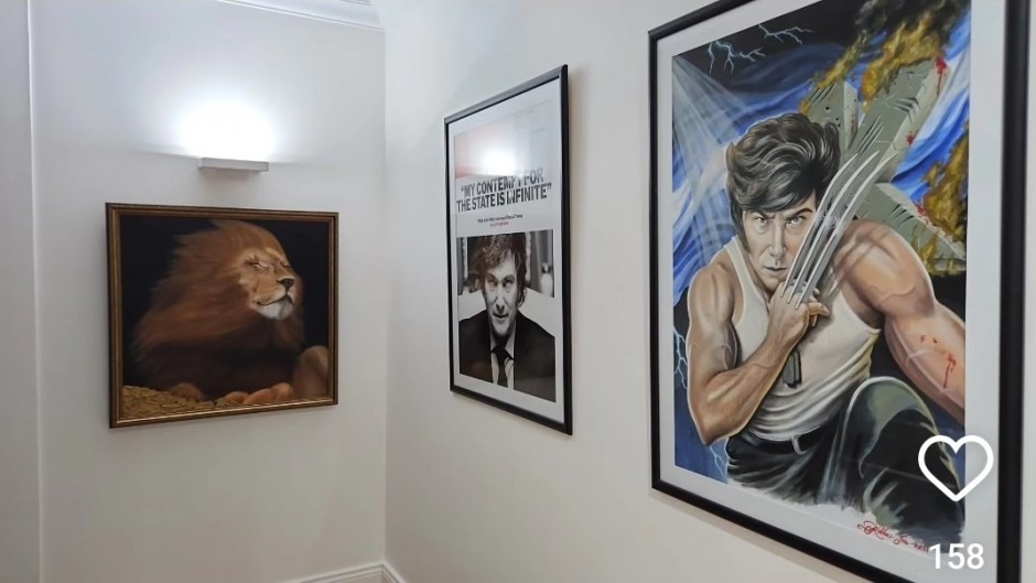 Javier Milei armó una galería de cuadros y fotografías de si mismo en la residencia de Olivos. El presidente colgó pinturas suyas encarnando a Wolverine, gigantografías de la revista Time y The Economist y en redes sociales hablaron de culto a la personalidad.