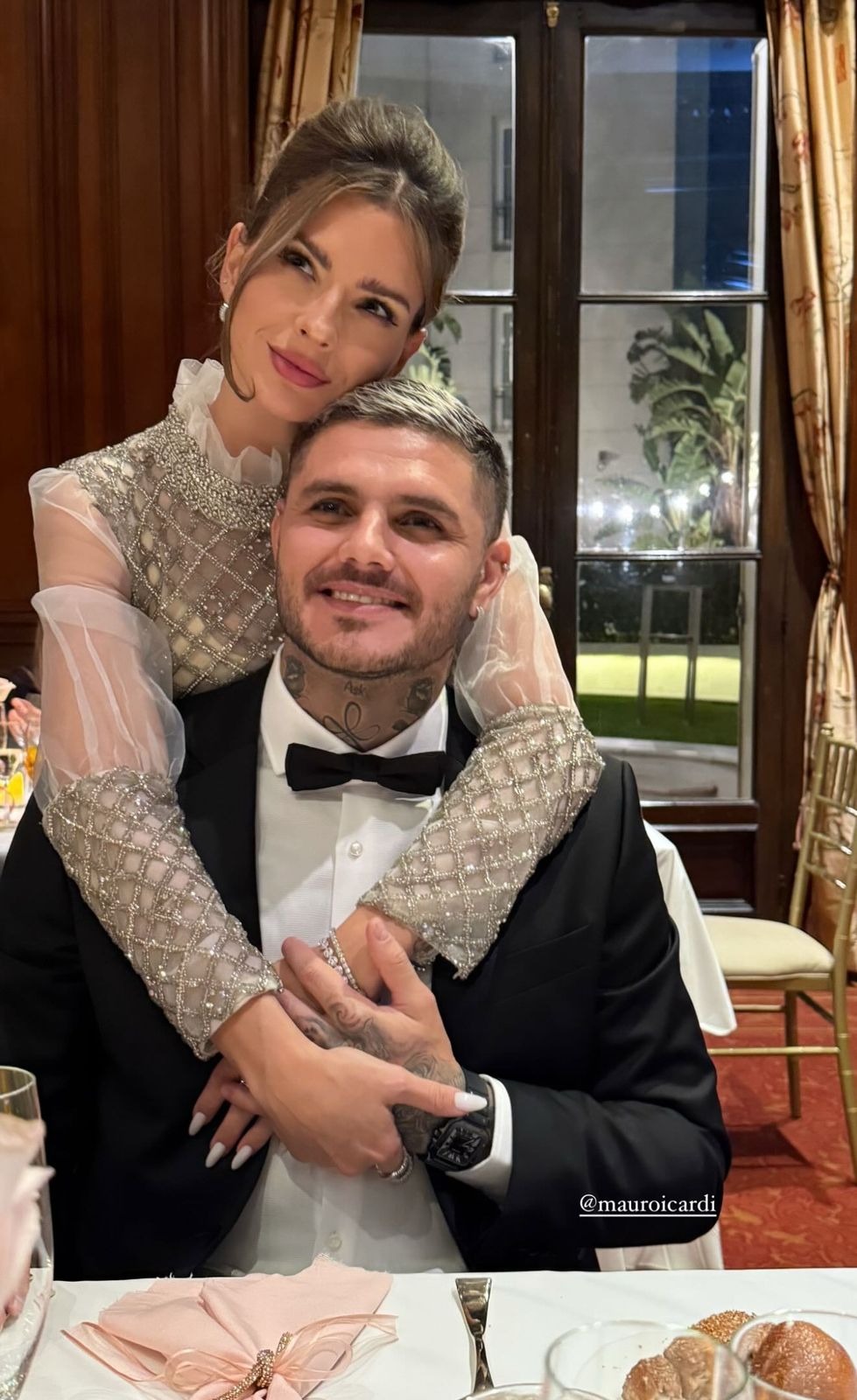 La homenajeada lució un vestido estilo renacentista de cuello alto y mangas abullonadas, complementado con un peinado recogido que resaltaba su elegancia. Por su parte, Icardi optó por un look clásico: camisa blanca, traje negro y un moño que armonizaba con la temática de la velada.
