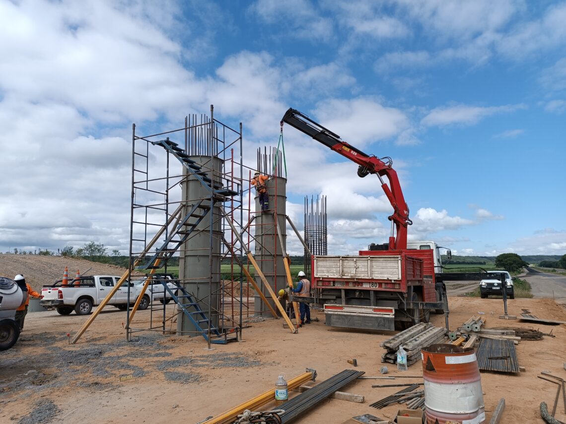Las tareas avanzan con la construcción de pilas de hormigón armado para el puente en el cruce cañero, km 1181, y para los puentes de los distribuidores en el acceso a Palo Blanco, km 1179, en el acceso a Lote Don Emilio, km 1182, y en el empalme con la Ruta Provincial 56, km 1188.