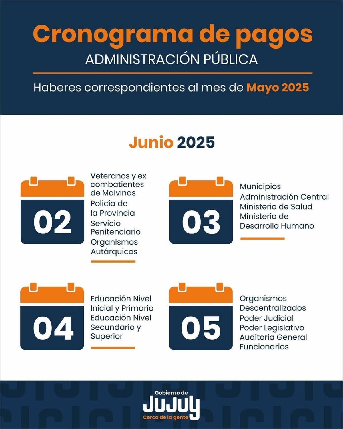 Martes 24/06/2025 Veteranos y ex combatientes de Malvinas, Policía de la Provincia, Servicio Penitenciario, Organismos Autárquicos, Municipios, Administración Central, Ministerio de Salud y Ministerio de Desarrollo Humano. Miércoles 25/06/2025 Educación de Nivel Inicial, Primario, Educación Nivel Secundaria y Superior; Organismos Descentralizados, Poder Judicial, Poder Legislativo, Auditoria General y Funcionarios.