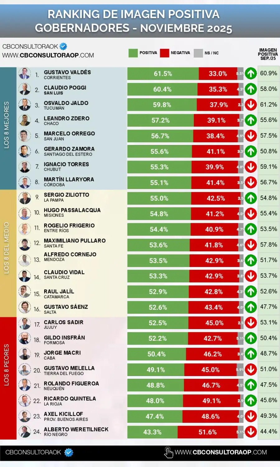 Según el informe, el gobernador de Corrientes, Gustavo Valdés, encabeza el ranking con un 61,5% de imagen positiva.