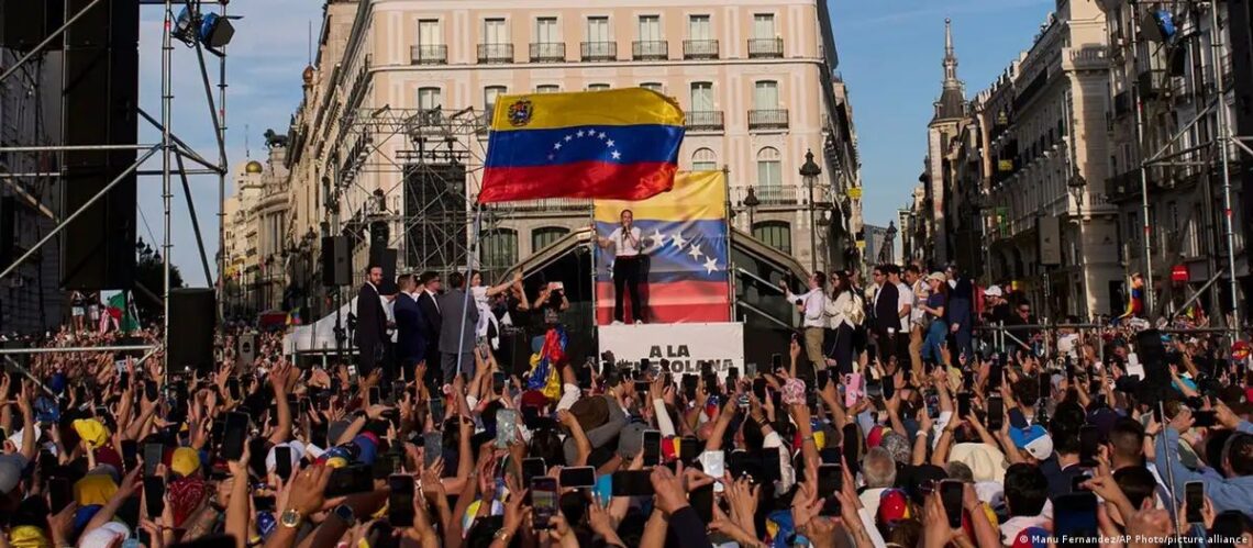Miles de venezolanos llenaron la Puerta del Sol de Madrid para ver por primera vez en muchos años a Machado, que abandonó Venezuela en diciembre para recibir el Nobel de la Paz en Oslo tras pasar más de una década sin salir del país.